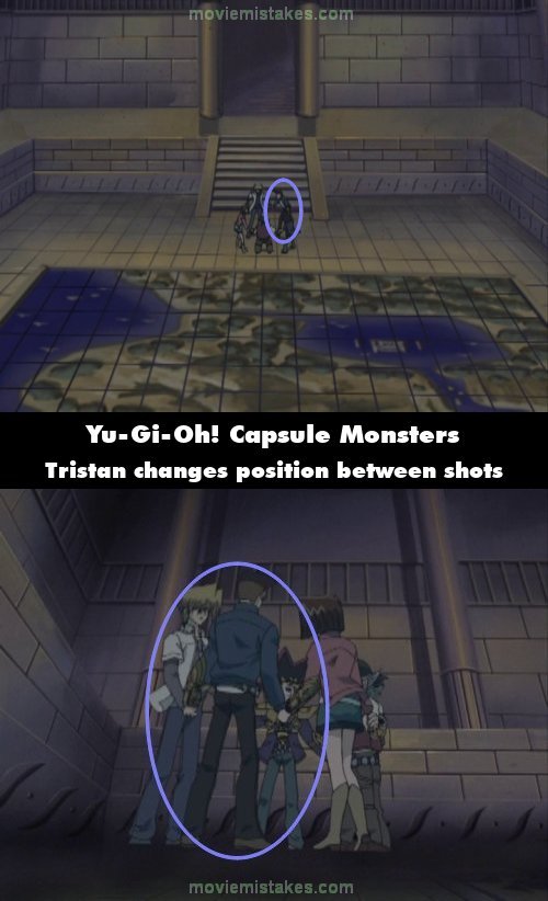Continuity mistake: Upon returning to the real world, the main characters are standing while holding hands together. In the first shot, Tristan is on Joey's left and Tea is on Joey's right. When the shot cuts, both Tristan and Tea are on Joey's right. (00:15:28)