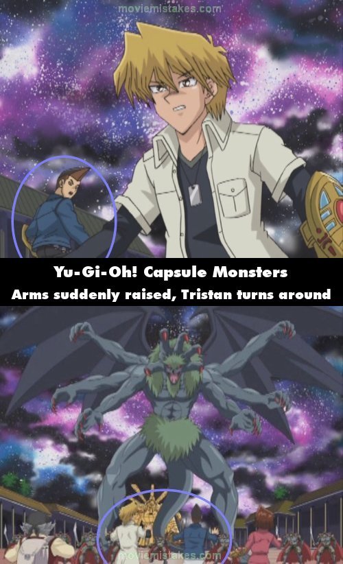 Continuity mistake: When Yugi falls to the ground, Joey says, "Yugi," and Tristan turns his head to face them. At this moment, Joey's arms are mostly lowered, and Tristan has his back to Yugi and his head turned. But in the next shot, Joey's arms are raised and Tristan has turned around (also with his arms raised). (00:14:51)