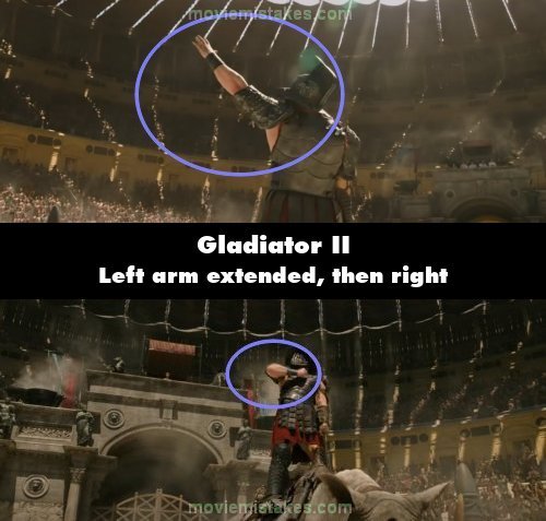 Continuity mistake: A gladiator arrives on a rhino and salutes the crowd. Before the fight, he raises his left arm in salute. A shot later, from a different angle, his left hand is holding the reins, and he is now saluting with his right hand.