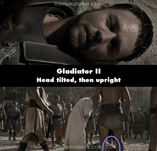 Continuity mistake: When Maximus dies, his head falls to the left, with his chin resting against the armour. In the following shot, as the others approach to lift him, his head is suddenly upright and facing straight ahead.
