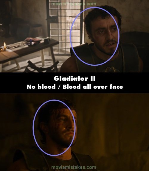 Continuity mistake: When Ravi is healing Lucius, there is no blood visible on the right side of his face (screen left). However, as they walk toward the "What we do in life" inscription, Lucius's face is suddenly covered in blood. (01:29:15)