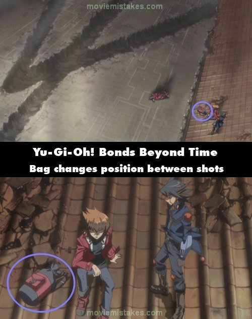 Continuity mistake: When Yusei is talking to Jaden on the roof after saving him, in the wide shot where Yusei asks Jaden if he is OK, Jaden has a bag on the roof with him. The bag is positioned in front of him, but when the shot cuts, it is aligned with his legs. (00:21:02)