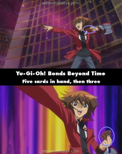 Continuity mistake: On Jaden's first turn, he has five cards in his left hand and draws one card from his deck, totalling six cards. He then activates Polymerization (the card he drew), but there are only three cards in his left hand, despite not using any others. (00:37:50)