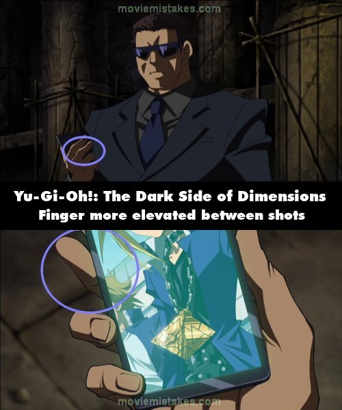 Continuity mistake: When the security guard takes out his phone to look at a photo of Yugi wearing the Millennium Puzzle, his fingers are placed over the left-hand side of it. His middle finger appears to be at a more elevated angle when it cuts to a close-up of the phone. (00:02:40)
