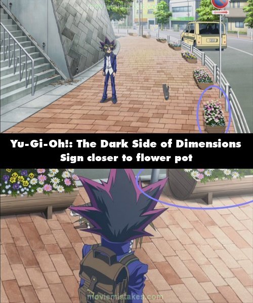 Continuity mistake: A sidewalk that Yugi runs down on his way to school is shown to have several flower pots placed along it. There is a sign on the sidewalk that is positioned a fair distance from the flower pots. But in the next shot, the sign has moved closer to one of the flower pots. (00:03:39)