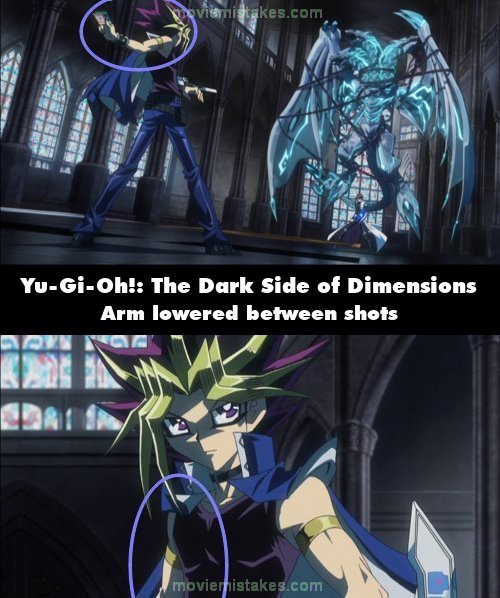 Continuity mistake: When Kaiba says "and even though they may never go away, something can be done to make them easier to live with" while dueling the Pharaoh in the simulation, the Pharaoh is shown extending his right arm behind his back after drawing from his deck. When the shot cuts, his right arm is lowered. (00:16:47)