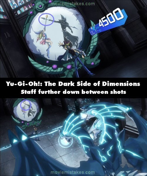 Continuity mistake: The Pharaoh activates Dimension Reflector, which allows him to banish Dark Magician and Dark Magician Girl in order to summon a mirror monster. On the mirror monster, the two magicians are shown clashing their staffs against each other. In the following shot after that, Dark Magician Girl's staff is further down Dark Magician's staff. (00:18:20)