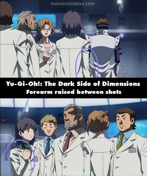 Continuity mistake: While Kaiba is speaking with the technicians after the simulation duel, in the shot where one technician says "And you defeated him soundly, sir" and another one says "I concur, it was no contest", a technician with dark hair can be seen with her arms at her side. When the shot cuts, her right forearm is raised. (00:20:15)
