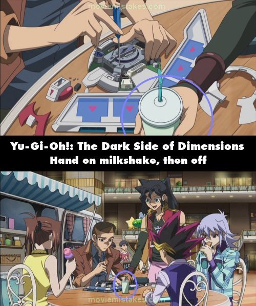Continuity mistake: At the mall, when Devlin asks Tristan, "Isn't that Joey's duel disk?", he places a milkshake on the table, and his hand is holding onto it. But in the next shot, his hand is not touching the milkshake. (00:21:16)