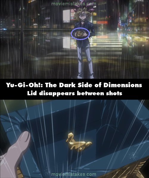 Continuity mistake: When Sera disappears after telling Yugi to save her brother, Yugi looks down at the box. The lid is on the box when he looks down, but in a close-up, the lid has disappeared. (01:13:22)