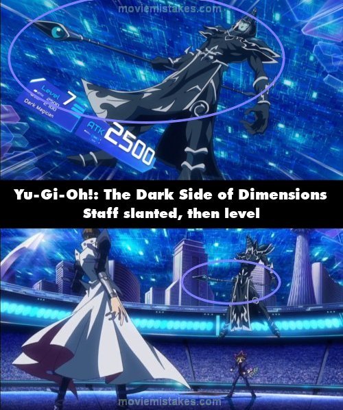 Continuity mistake: When Yugi summons Dark Magician, its staff is slanted. When the shot cuts, the staff is level. (01:36:42)