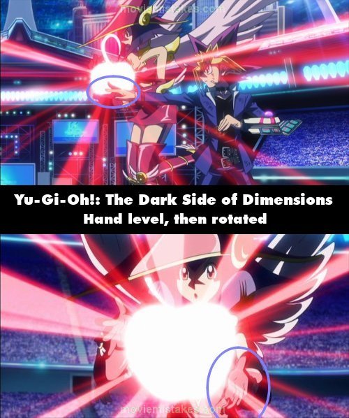 Continuity mistake: Yugi uses the effect of Apple Magician Girl to summon Lemon Magician Girl. Apple Magician Girl then creates a magic apple, which begins to expand. Her left hand is level (with her thumb raised) when the magic apple appears in her hands, but when the shot cuts, her left hand is rotated. (01:39:02)