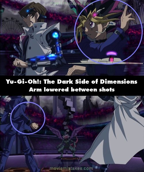 Continuity mistake: After Yugi summons Gold Gadget, he says, "Then I'll end my turn with this," before setting a card. His right arm is pointed to the left after setting the card, but when the shot cuts, his right arm is lowered. (01:50:19)