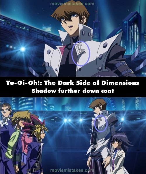 Continuity mistake: When Kaiba tells Yugi "I told you so" after the Pharaoh returns, there is a shadow on his coat. The shadow is shown going over the KC logo, but when the shot cuts, the shadow is further down the coat and is no longer cast on the logo. (01:58:18)