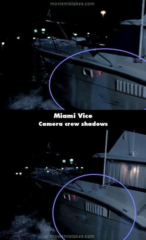 Visible crew/equipment: Crockett and Tubbs force the owner of a boat to drive them to a meet-up with the bad guy. When the boat is sailing out of the harbour, the shadows of the camera crew can be seen cast on the side of the boat. (01:26:45)