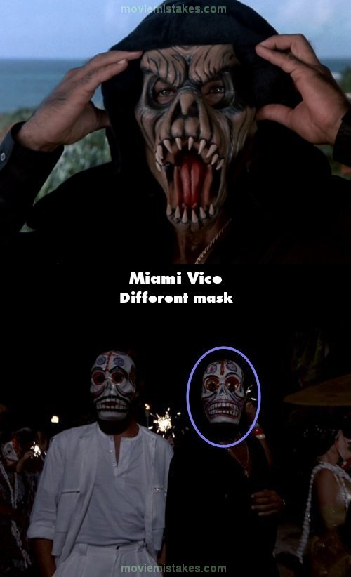 Continuity mistake: Shortly before going to the party, Crockett and Tubbs receive masks to wear. Tubbs tries on his mask, but when they are at the party in the following scene, he is wearing a completely different mask. (00:35:15 - 00:36:00)