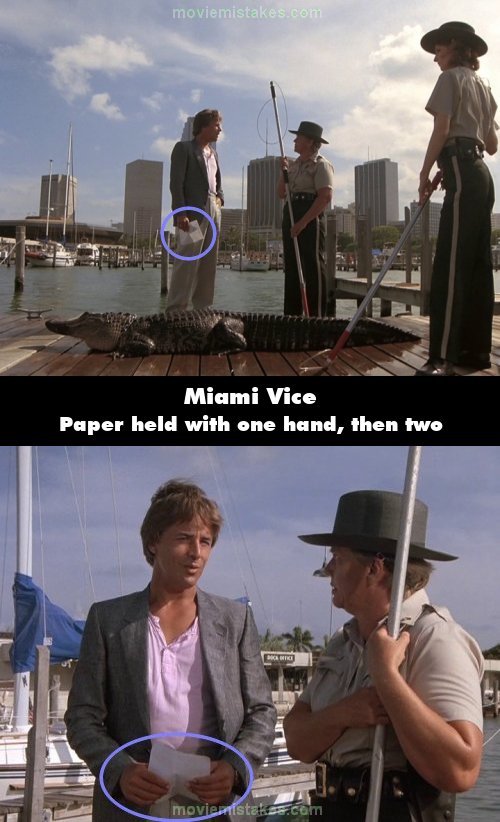 Continuity mistake: While trying to apprehend Elvis, one of the animal control women says, "He's gonna be tagged and released in the Everglades," to Crockett. When she says this, Crockett is holding the complaint paper with one hand. But in the next shot, he is holding the paper with two hands. (00:12:48)