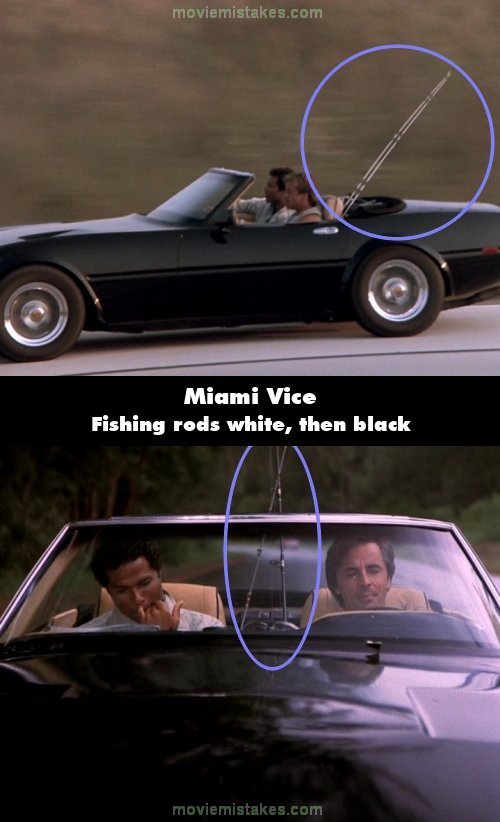 Continuity mistake: When Crockett and Tubbs are driving to Okeechobee, the two fishing rods in the back of the car are white. When they arrive in Okeechobee, the fishing rods are black. (00:11:15 - 00:12:52)