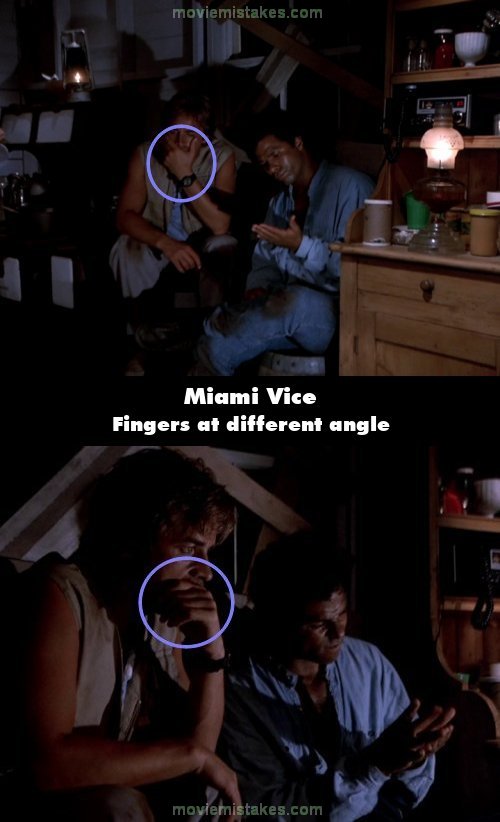 Continuity mistake: Crockett sits down next to Tubbs while Tubbs slaps a fly on his neck. When Crockett sits down, he puts his hand over his face, with his fingers at an elevated angle. When the shot cuts, his fingers are at a horizontal angle. (00:30:37)