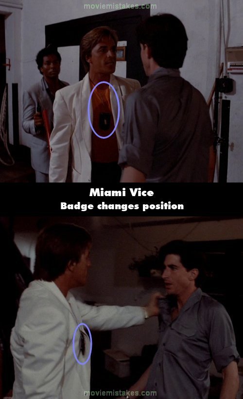 Continuity mistake: When Crockett is arresting Rickert, he is wearing his badge around his neck. The badge is positioned in the centre of his chest when he is grabbing onto Rickert's chest, but when the shot cuts, the badge is over the right-hand side of his chest. Then in the next shot, the badge is over the centre of his chest again. (00:11:03)