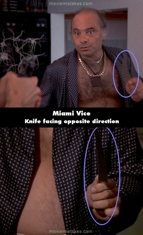 Continuity mistake: Just before Gina shoots Ramirez, he is holding a knife in his hand. The knife is held so that the sharp end is facing to the right, but in a close-up of the knife right before the gunshot, the sharp end is facing to the left. (00:46:40)