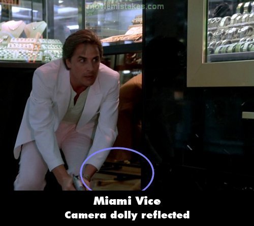 Visible crew/equipment: When Crockett is crouching alongside the jewellery store while chasing the suspect, he briefly stops beside a mirror-like window before continuing to crouch. When he resumes crouching, the reflection of the camera dolly can be seen in the mirror-like window. (00:03:17)