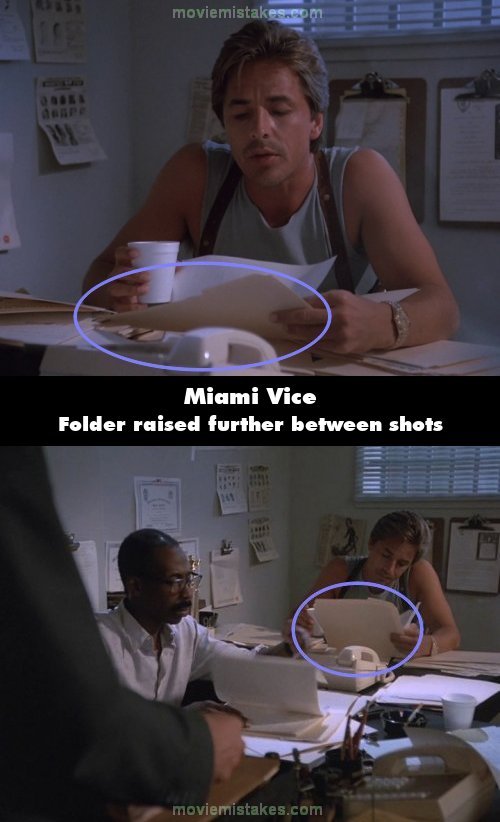 Continuity mistake: When the team are looking over some files, Crockett is reading from a folder that is lifted up off the table. The shot cuts and the folder is suddenly raised much further towards him. (00:26:03)