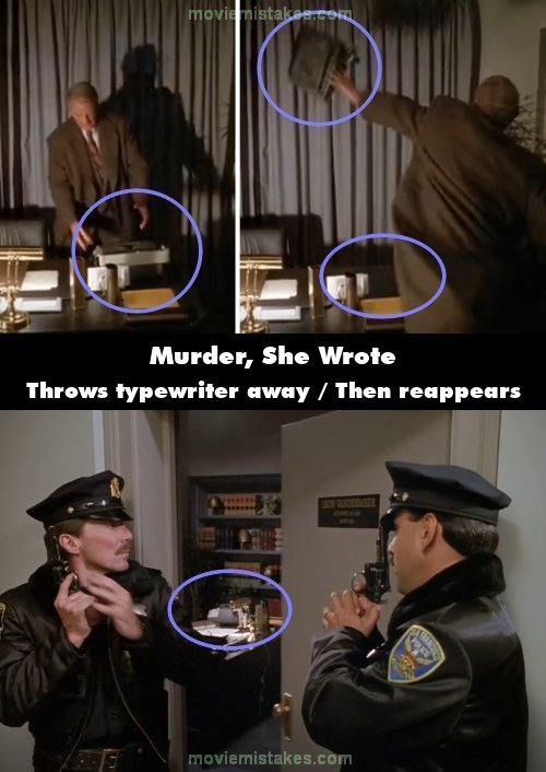 Continuity mistake: Dennis grabs the typewriter and throws it out of the window. However, just before the police enter the office, the typewriter is back on the table. Once they come inside, it disappears again.