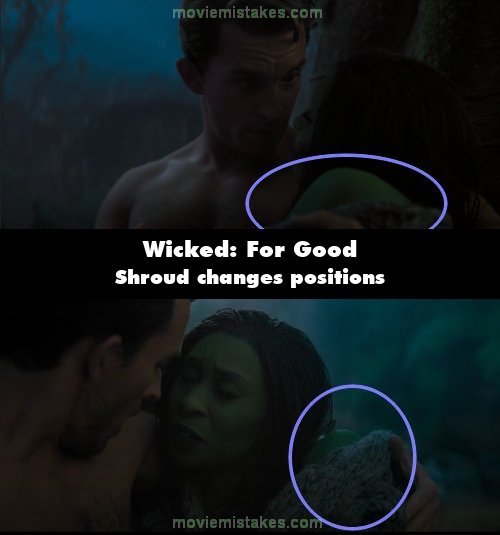 Continuity mistake: When Elphaba and Fiyero are lying together, the blanket draped over her arm shifts position between instant cuts, alternately revealing and concealing more of her arm. (01:18:48)
