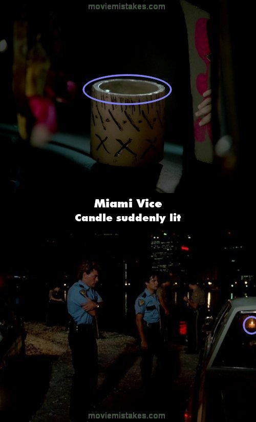 Continuity mistake: When Castillo finds the dead cop at the start of the episode, he lights a candle on the dashboard, but the flame is blown out a few seconds later. Later in the scene, when the cop's colleagues arrive and they approach the car, the candle is suddenly lit again. (00:00:55 - 00:01:40)