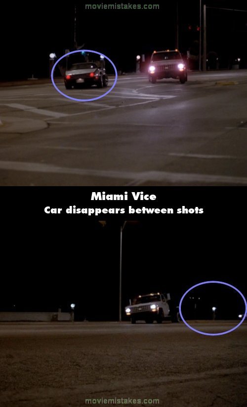 Continuity mistake: While Crockett is chasing after Robbie, Robbie's car swerves past a truck containing wood and water. In the first shot, Robbie's car is shown right next to the truck just as he drives past it. When the wood and water fall out of the truck in the next shot, Robbie's car has disappeared. (00:44:46)