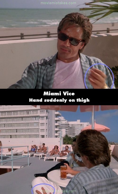 Continuity mistake: When Crockett and Tubbs are talking while at the hotel, there is a shot of Crockett saying, "Give him my love," where he wipes his chin and begins to move his hand away from his face. When the shot cuts, his hand is suddenly on his thigh. (00:08:42)