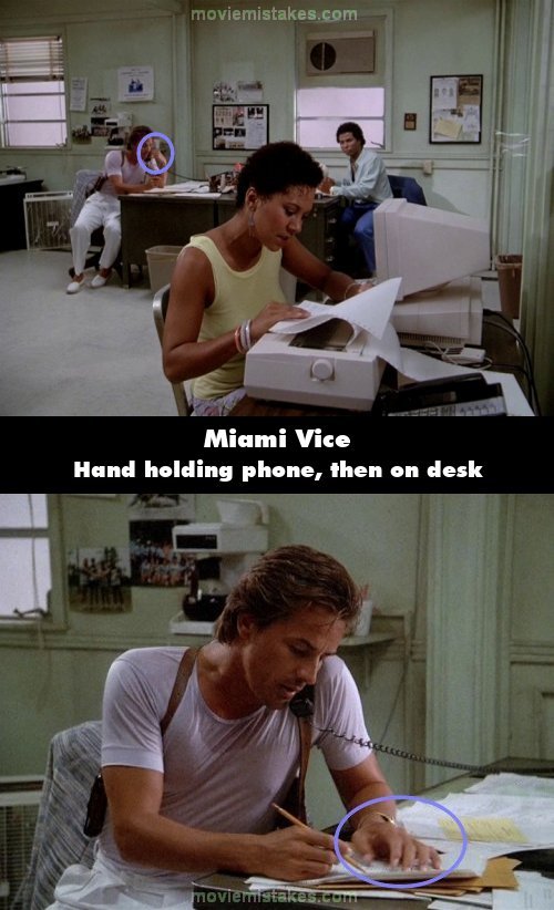 Continuity mistake: When Trudy is reading Maria Rojas' record, Crockett can be seen in the background holding onto a phone with his left hand, while looking over a report with his right hand. The shot then cuts to a closer angle of Crockett, where he is looking over the report with both hands, while the phone is being held by his shoulder. (00:10:10)