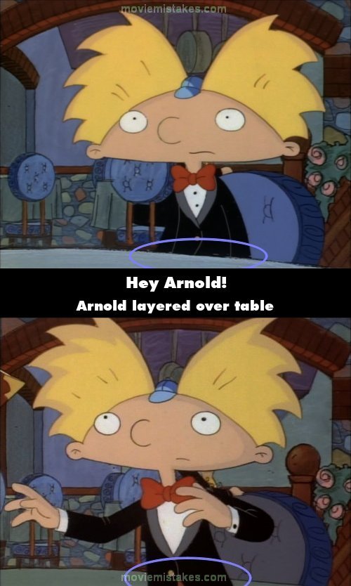 Other mistake: At Chez Pierre, when the waiter takes Arnold's menu, Arnold is mistakenly displayed in front of the table instead of behind it like he should be. (00:13:25)