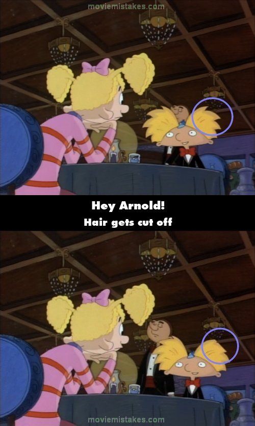 Other mistake: At Chez Pierre, after Helga asks Arnold how he likes his school, as Arnold says, "It's pretty good, I guess," part of his hair crosses an invisible line and disappears. (00:13:00)