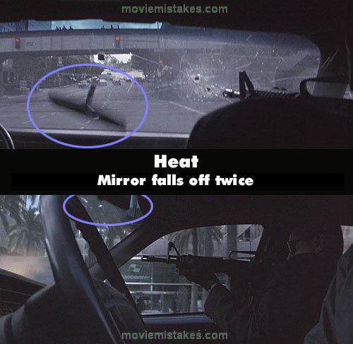Continuity mistake: In the shootout scene when they drive away in the car, De Niro is seen in slow motion as he realises there are cops in front of them as well as behind. He raises his weapon and fires, knocking the rear-view mirror off the window. In the shot directly after he is seen still firing his weapon and the mirror falls off the window again.