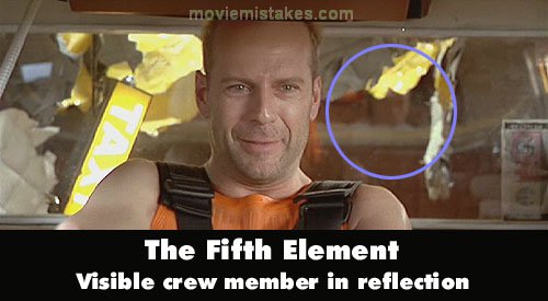 Visible crew/equipment: Just after Korben escapes from the police, you can see a reflection of a crewman in a blue T-shirt on the windshield.
