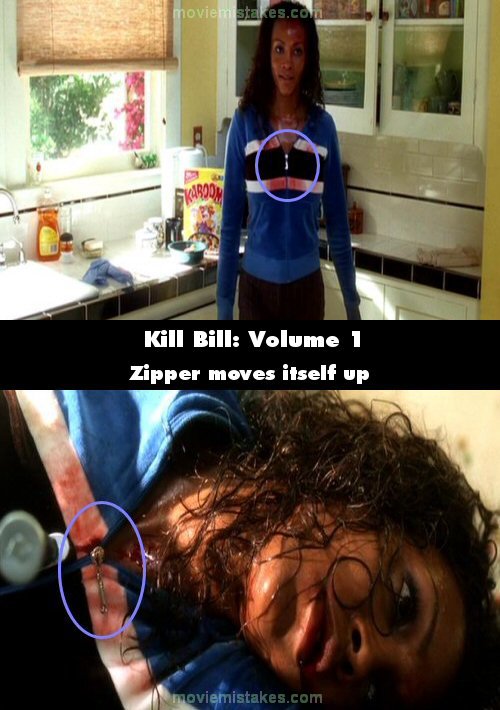 Continuity mistake: When The Bride and Vernita fight and during their kitchen chat, Vernita's zipper is in the black-band portion of her sweater. After the knife penetrates Vernita, the zipper is now higher up into the white-band portion of the sweater just above the knife. (00:12:30)