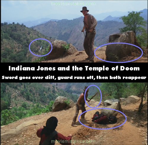 Continuity mistake: When Indy fights the two guards before the bridge scene, the sequence is all off. He knocks one to the ground, who lands still clutching his sword. The other one has his sword whipped away from him - it flies over the cliff, and he runs off, whimpering. We then see the other guard approach, and suddenly Indy's standing over an unconscious guard by the boulder and clutching a sword, both of which have appeared from nowhere. (01:37:25)