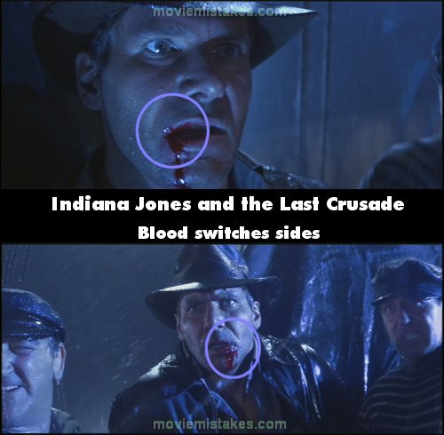 Continuity mistake: In the beginning, when Indy is fighting aboard the Coronado ship, the very first time we see Indy in this scene (before we see him get punched), he is bleeding from the right side of his mouth. Throughout the remainder of the scene, he is bleeding from the left side of his mouth. (00:11:50)
