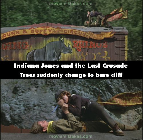 Continuity mistake: In the beginning where Indy is young, he fights some guys on that zoo train. When he's on the crate with the rhino in it, the background changes in each shot. Once there are trees behind and a split of a second later there are rocks, once there's a cliff and once a plain, and it all changes in splits of seconds as they change shots. (00:07:25)