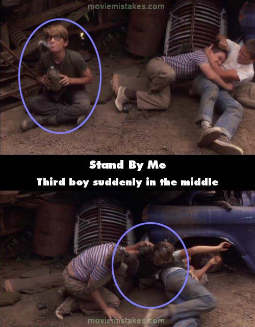 Continuity mistake: When the boys are at the junk yard and they nominate Gordy to get the food, when Gordy jumps up and starts joking with the boys, Vern and Chris start to fight. Then the shot changes and suddenly Teddy, who was off to the side, is in the middle of the pile. (00:23:35)