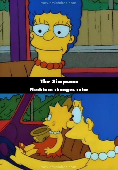 Continuity mistake: When Marge is driving Lisa to school, in one shot you can see that her necklace is red. Then in the next shot it is white. It then changes back to red and stays that way.