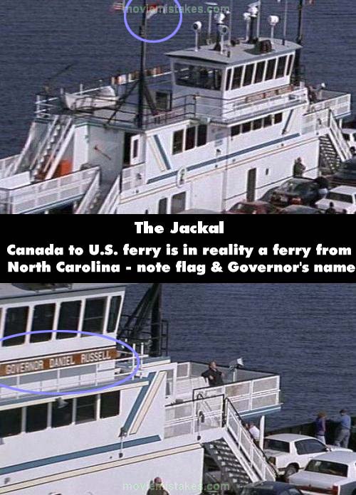 Factual error: On the ferry boat ride, which should have been from Canada to the United States, they were aboard a North Carolina ferry... The North Carolina flag was flapping in the wind next to the US flag. There was a closeup, and you could even see the name of the boat, which is named after a North Carolina Governor, and home ported in Moorhead City, North Carolina. (01:15:20)