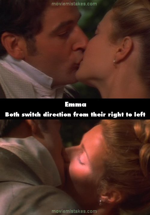 Continuity mistake: When Emma and Mr Knightley kiss for the first time near the end, they are both tilting their heads to the right when the camera angle is from Emma's perspective. Then, the instant the camera changes to Mr Knightley's perspective, they are suddenly tilting their heads to the left.