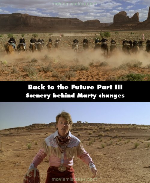 Continuity mistake: When Marty is inside the cave (where he hides the DeLorean), keep a close eye on the huge landscape and very large mountains behind Marty when he is screaming at the bear. The entire background changes when he runs out of the cave to just a few hundred yards of ground before it drops down, where Marty falls into the fence. What happened to the vast landscape and mountains? (00:20:30)