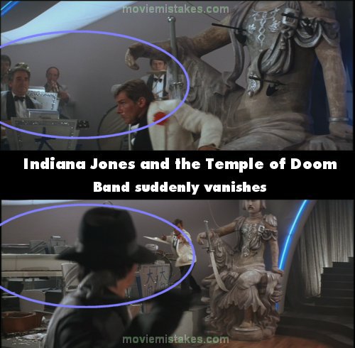 Continuity mistake: Some bad guys throw knives at Indy as the band is seated and playing "Anything Goes". Then Indy throws a cymbal at one of the bad guys and the entire band is now gone. (00:09:30)