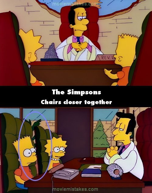 Continuity mistake: When Bart and Lisa see Reverend Lovejoy, their chairs keep moving closer/separating between shots. (00:13:05)