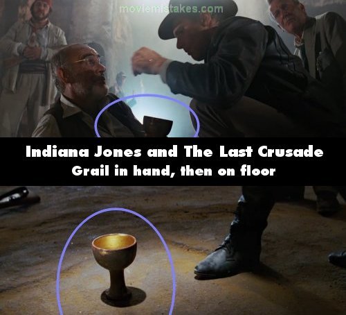Continuity mistake: In the temple in the Canyon of the Crescent Moon: After Harrison Ford cures Sean Connery by pouring water from the grail over him, Sean stands up with the grail in his hand. In the next shot, however, Alison Doody picks the grail up off the floor. (01:55:50)