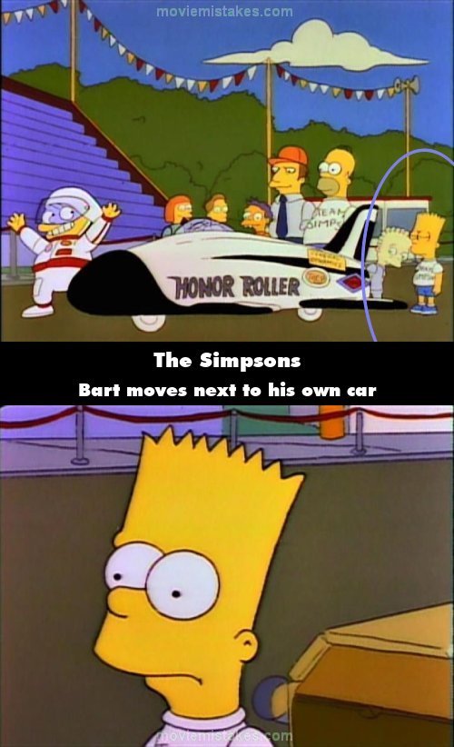 Continuity mistake: As Martin reveals his Honor Rollor at the time trials, we can see Bart on the right side of the screen. He suddenly appears beside his car in the next shot. (00:13:00)